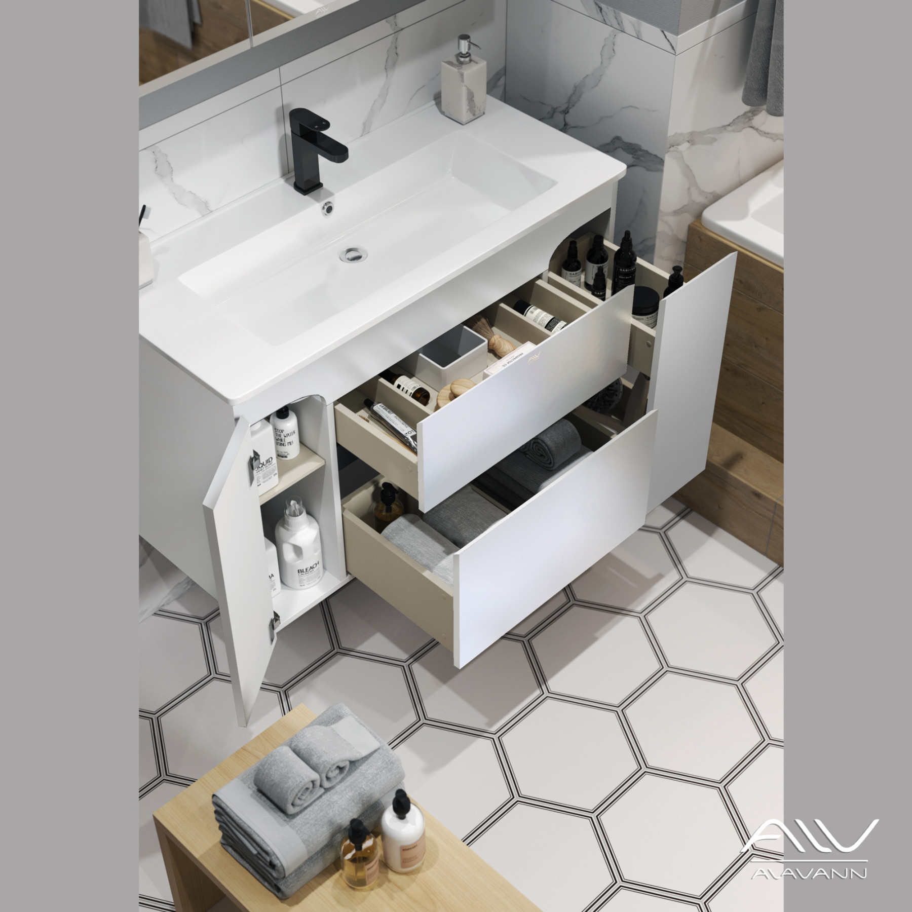 Тумба с раковиной Eva 100 состоит из 4х функциональных отсеков. Посередине 2 вместительных выдвижных ящика с покрытием "интерьерный лен". Внутри ящиков есть удобные съемные делители, которые позволяют грамотно организовать внутреннее пространство.
