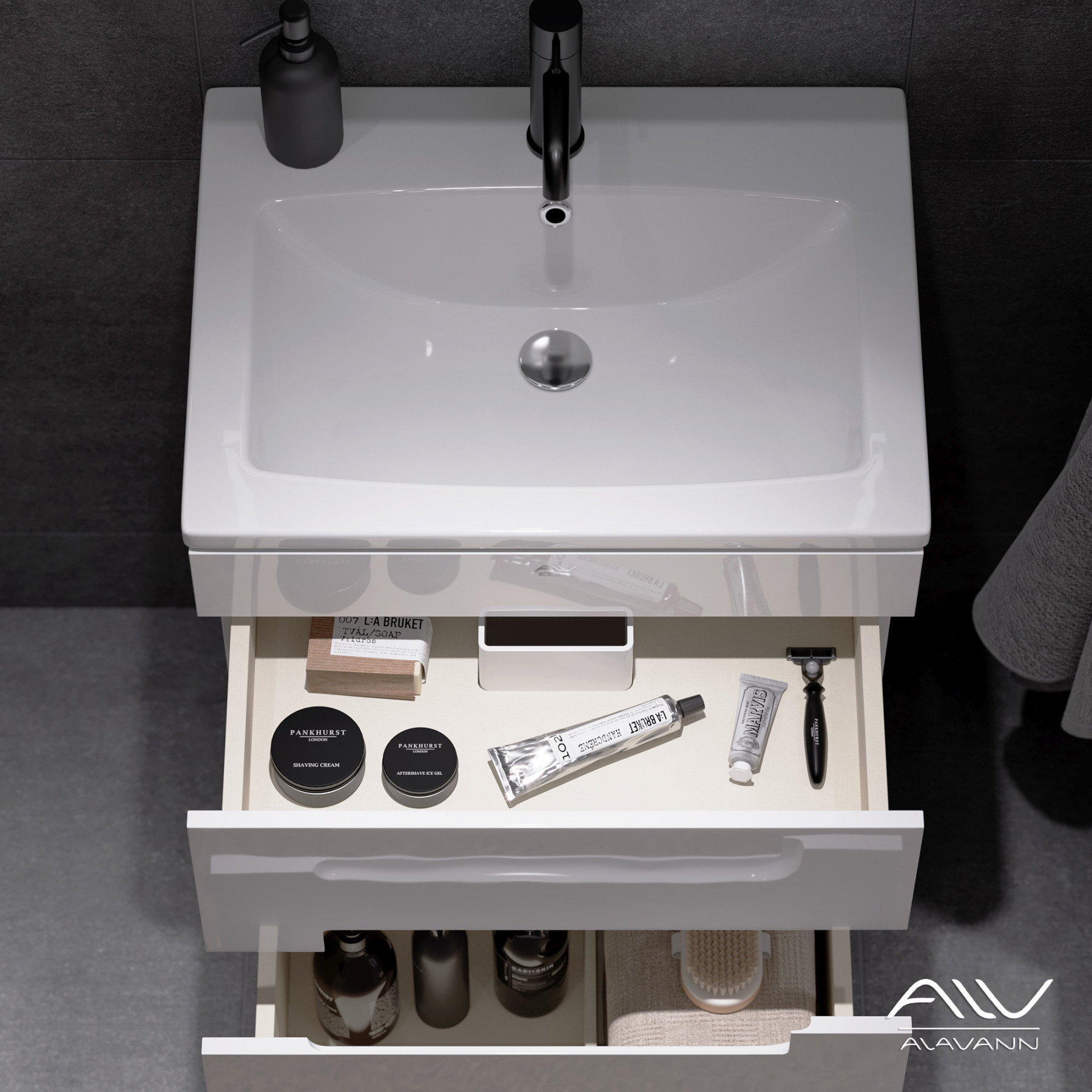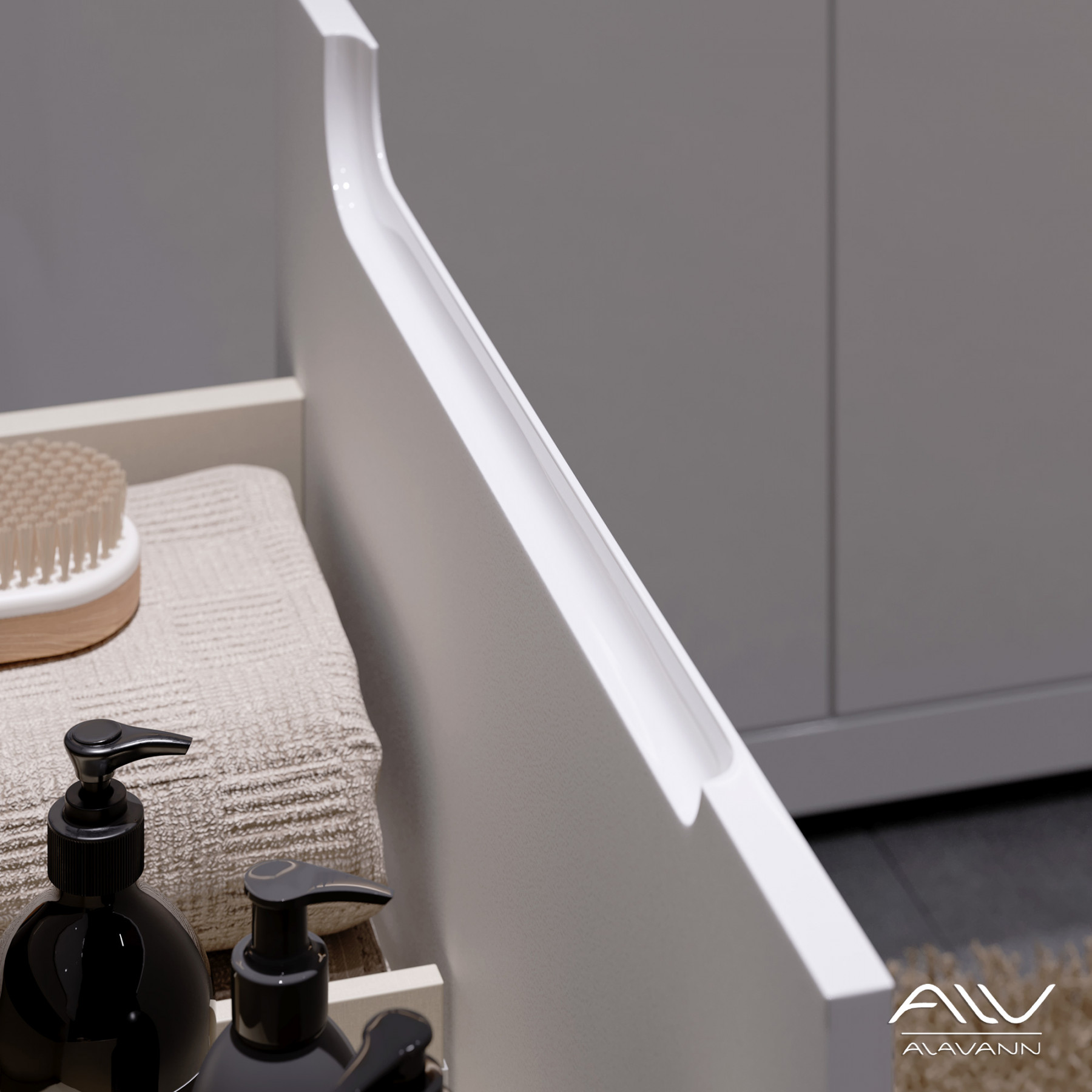 Два выдвижных ящика гарантируют практичное размещение всех необходимых предметов. В нижнем ящике имеется удобный съемный делитель из фирменного материала «интерьерный лен». Зацепы интегрированы в фасады, которые выступают за корпус тумбы по ширине на 17 мм с каждой стороны.