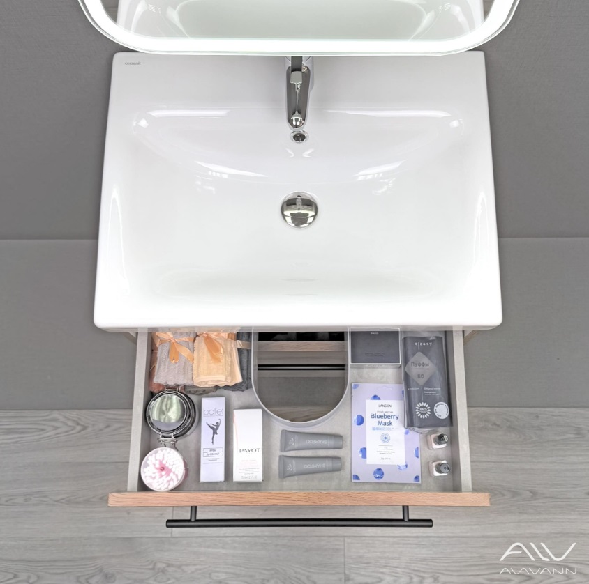 Два вместительных выдвижных ящика из ЛДСП в эффектном цвете «бетон», верхний компактный (524×334×71 мм), а нижний — глубокий (524×334×132 мм), идеально подходит для хранения крупных предметов. Доводчики обеспечивают мягкое и бесшумное закрывание. Функциональная ручка-релинг черного цвета может использоваться в качестве держателя для полотенец.