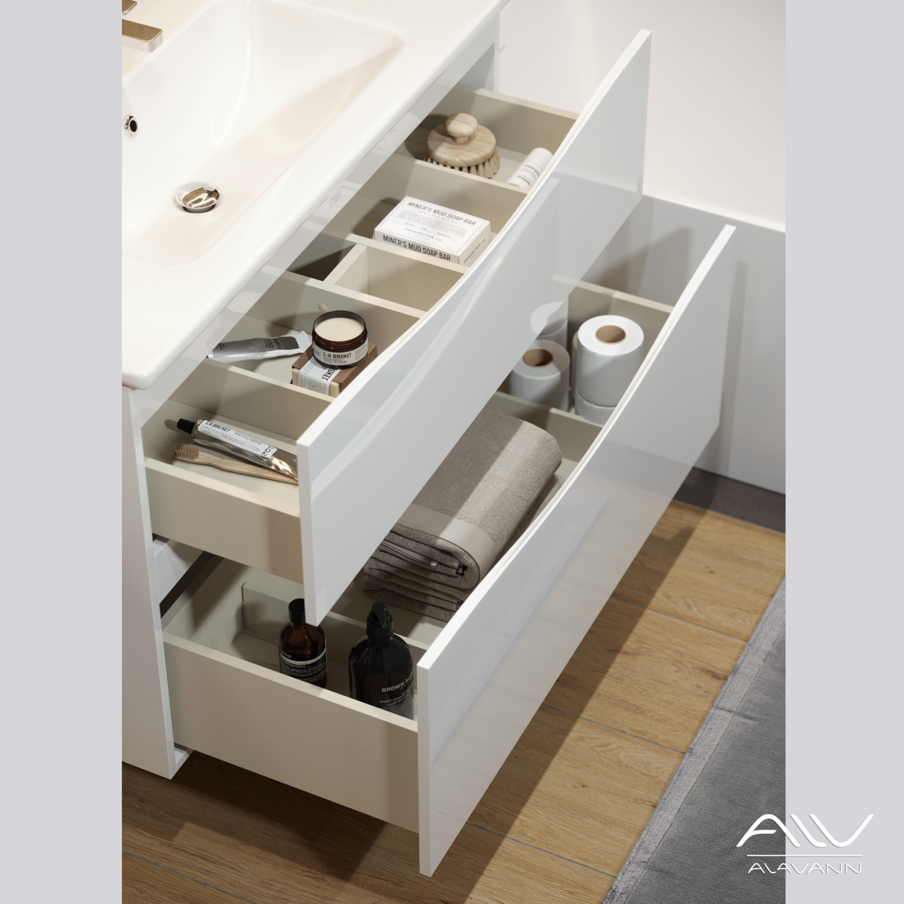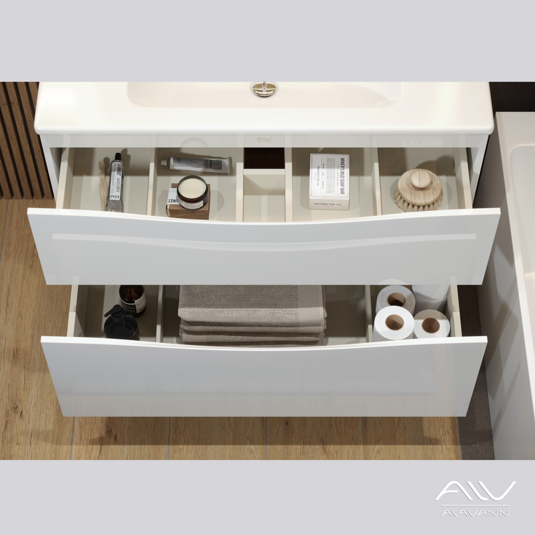 Ширина тумбы делает внутреннее пространство ящиков довольно вместительным и удобным для хранения необходимых вещей. Внутри ящиков имеются делители для более практичной организации пространства. В комплект также входит белоснежная раковина от европейского производителя.