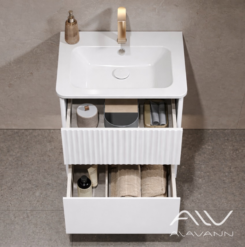 Название «Вейв» передает главную особенность дизайна – наличие декоративной фрезерованной волны на лицевой стороне верхнего выдвижного ящика. Нижний ящик – гладкий. Для более комфортного открывания предусмотрен удобный зацеп и система направляющих полного выдвижения. Обратный ход ящиков обеспечивается встроенными доводчиками. Раковина выполнена из керамики Никсон 60, Турция.