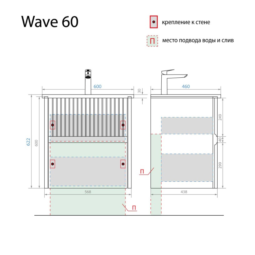 Тумба с раковиной Wave 60 белая - преобразит обстановку ванной и даст возможность держать «под рукой» полотенца и другие необходимые принадлежности. Компактная эргономичная модель шириной 600 мм отлично впишется в помещения небольшого метража, а подвесной способ установки создаст впечатление легкости и простора в интерьере.