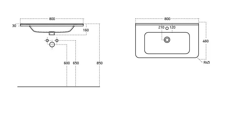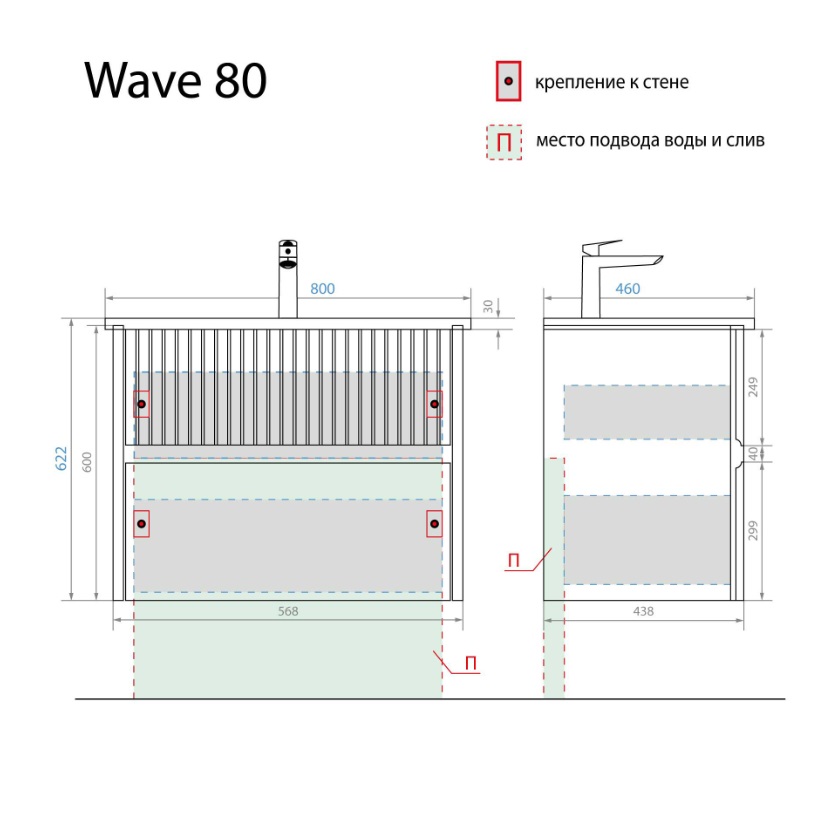 Ширина, глубина и высота раковины с тумбой соответствуют параметрам 800 мм х 460 мм х 622 мм, что дает возможность интегрировать ее в ванную комнату стандартного размера.