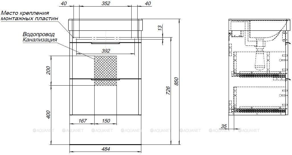 Тумба с раковиной Aquanet Ирис new 50 2 ящика
