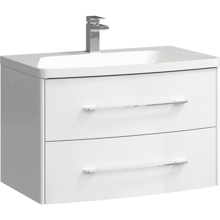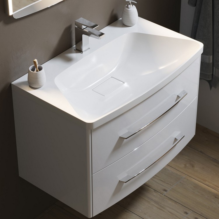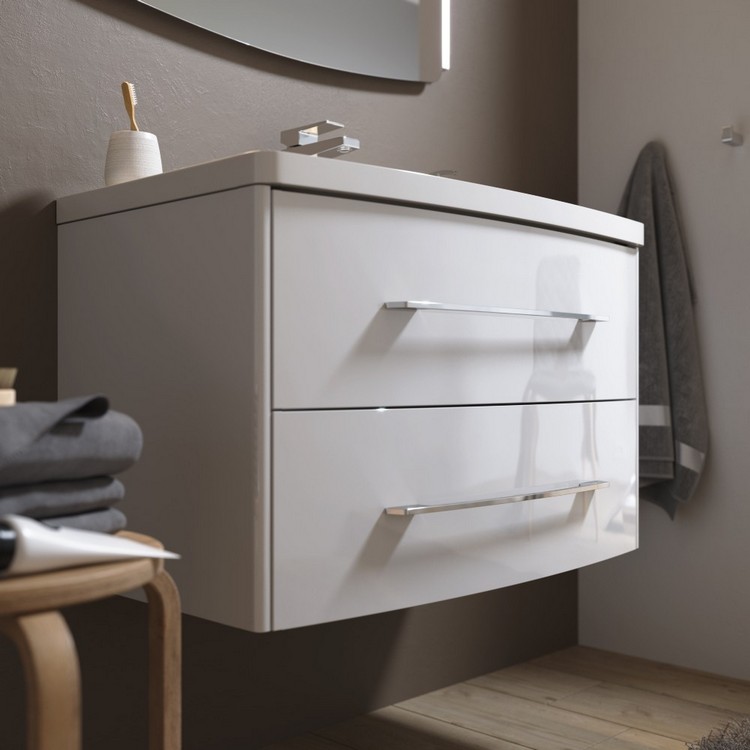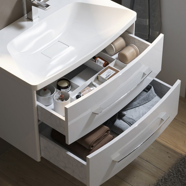 Подвесная тумба в цвете белый глянец с двумя ящиками с умывальником из литьевого мрамора