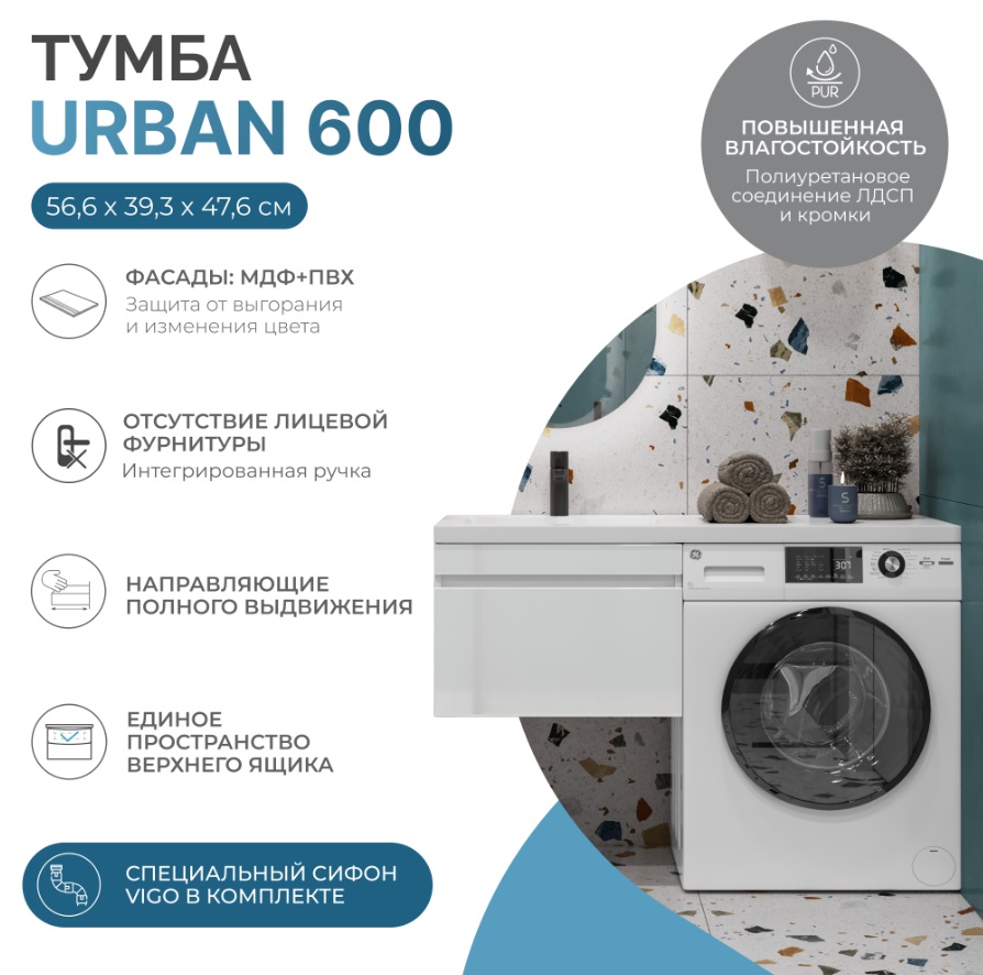 Тумба с раковиной Vigo Urban 120 L для стиральной машины, подвесная, 1 ящик |