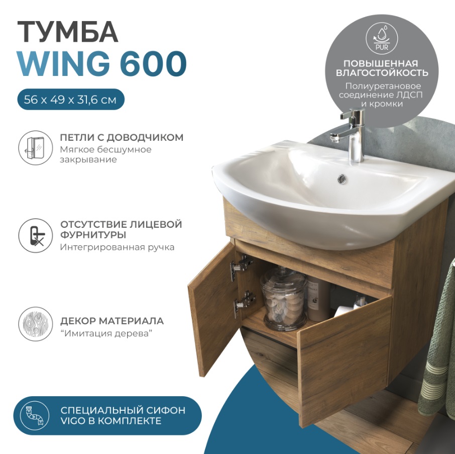 Тумба с раковиной Vigo Wing 60 подвесная, 2 дверцы, дуб золотой |