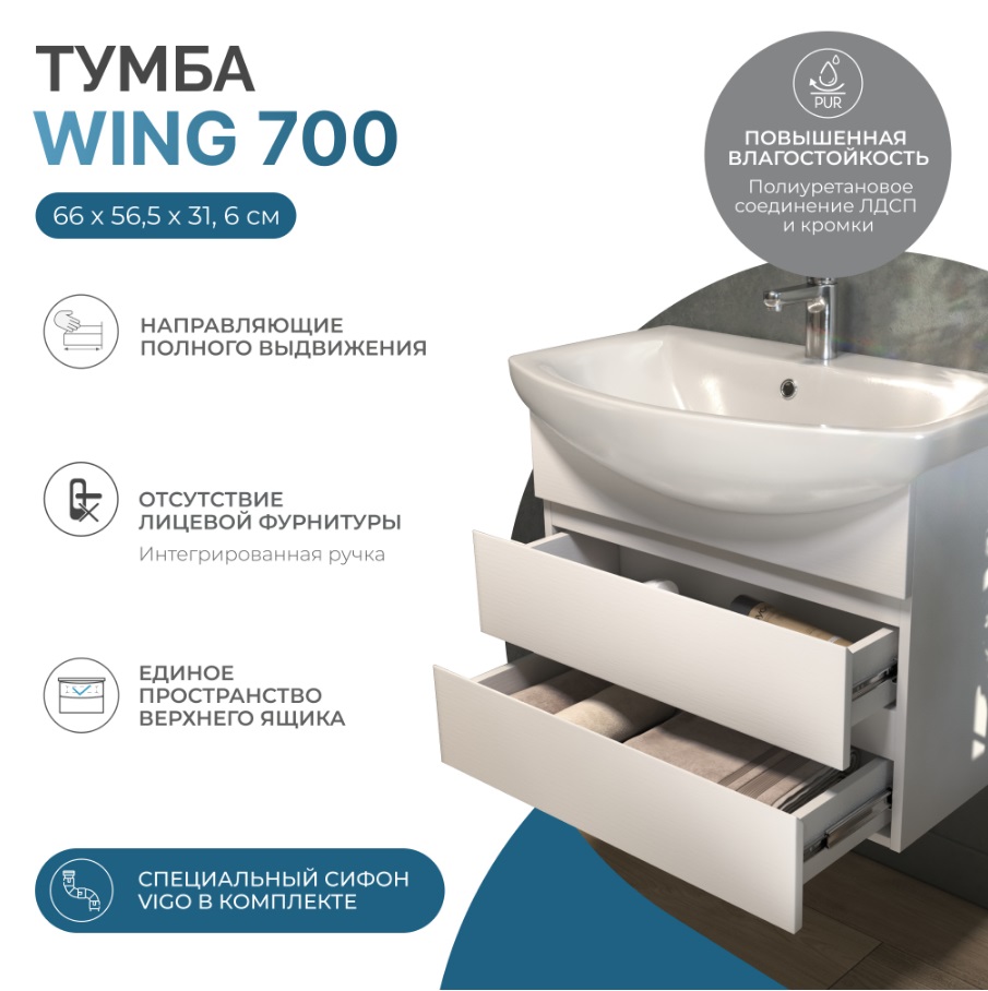 Тумба с раковиной Vigo Wing 70 подвесная, 2 ящика, белый