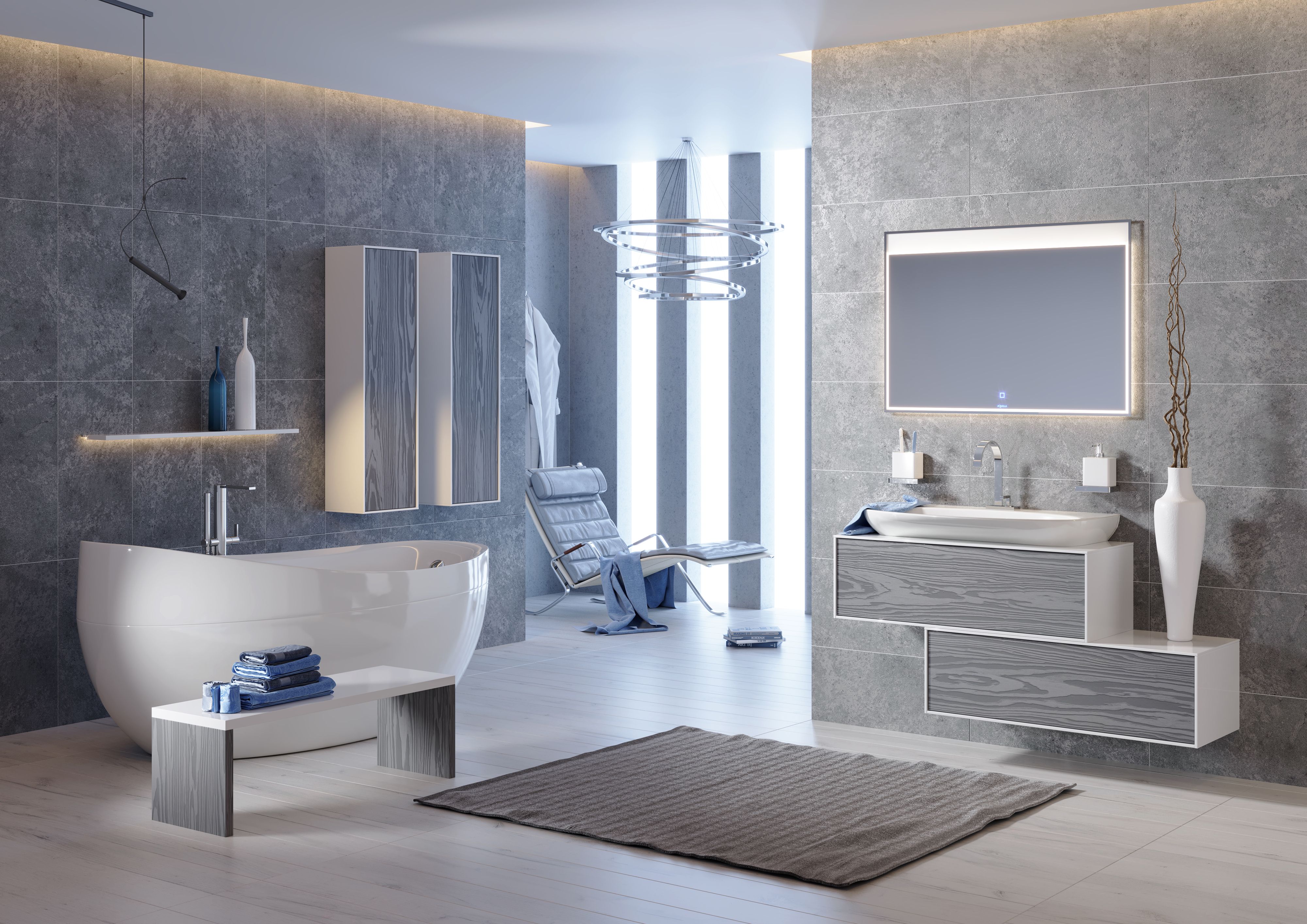 просторную ванную комнату в стиле хайтек.