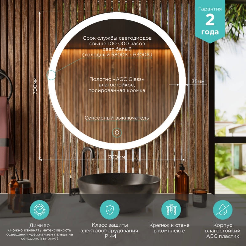 Настенное круглое зеркало для ванной Mixline с подсветкой D 80 см изготовлено из зеркального полотна толщиной 4 мм. Оснащено сенсорным выключателем и диммером, который при удержании пальца на сенсоре позволяет менять интенсивность освещения.