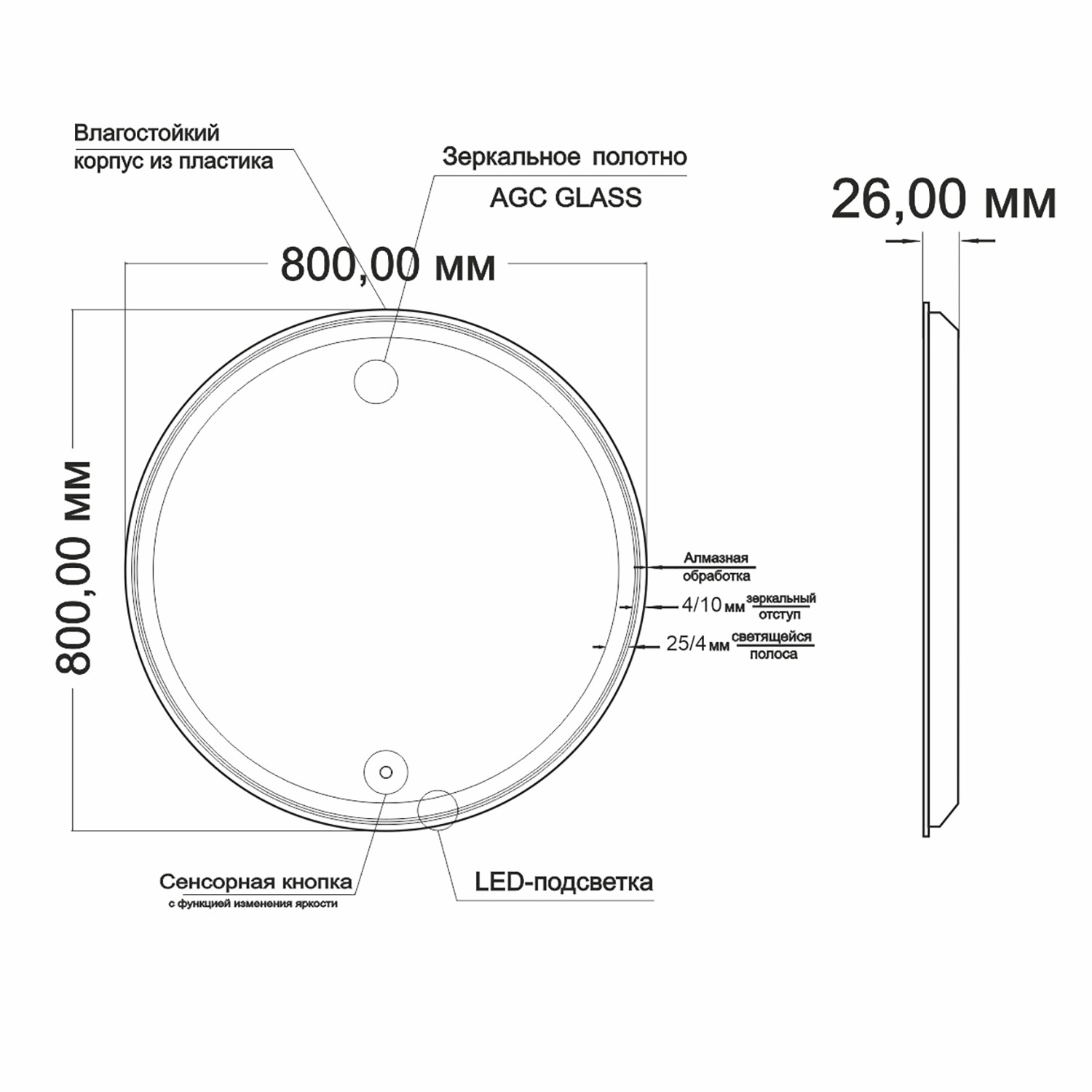 Настенное круглое зеркало для ванной Mixline с подсветкой D 80 см изготовлено из зеркального полотна толщиной 4 мм. Оснащено сенсорным выключателем и диммером, который при удержании пальца на сенсоре позволяет менять интенсивность освещения.