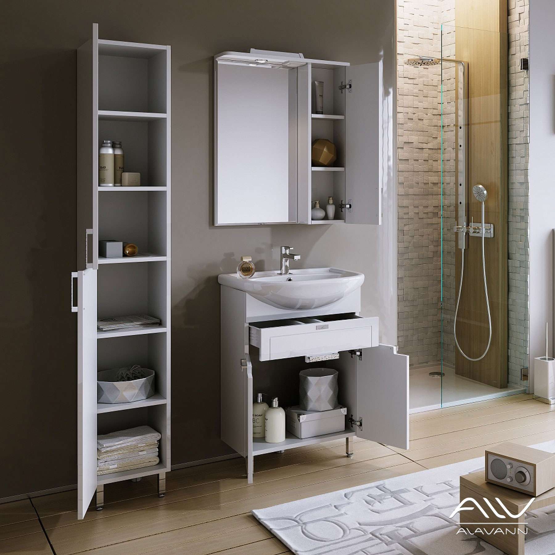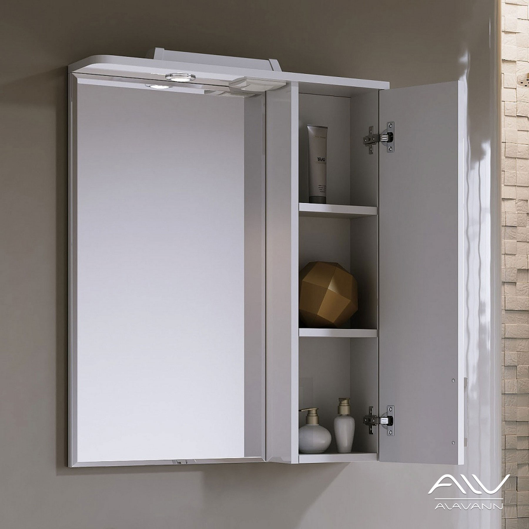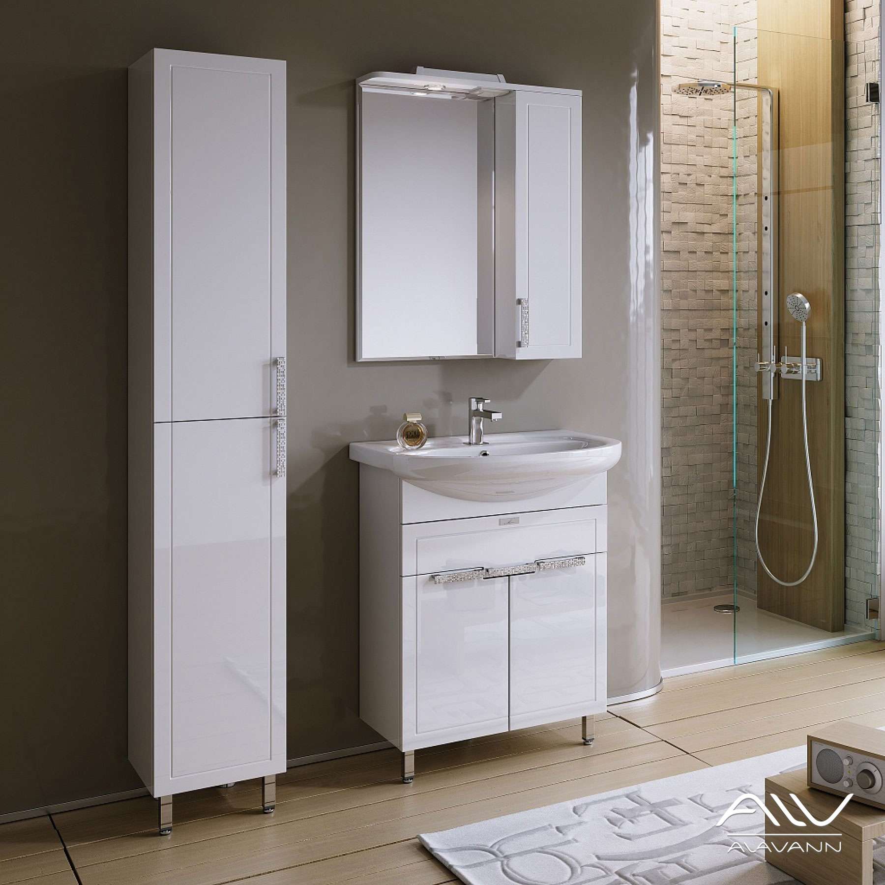 В козырек изделия встроена розетка 220В с выключателем и LED-светильник. Внутри шкафа две полки из ДСП (10 мм), петли на доводчиках плавного закрывания. Ручка декорирована блестящей мозаичной фактурой.