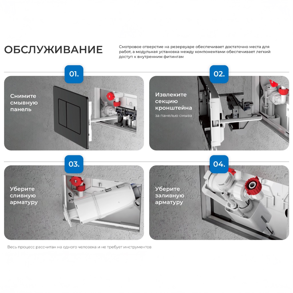 Инсталляция оснащена механическим двухрежимным сливом с регулировкой: малый смыв от 3 до 4 л и большой от 6 до 7 л, что делает ее эффективной и экономичной, позволяя настроить смыв в зависимости от ваших нужд.
