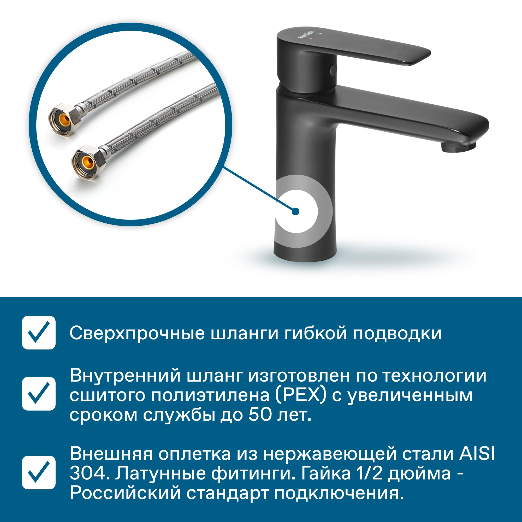 - сверхпрочные шланги гибкой подводки, изготовленные по технологии сшитого полиэтилена (PEX) и сроком службы до 50 лет, в оплетке из нержавеющей стали AISI 304.