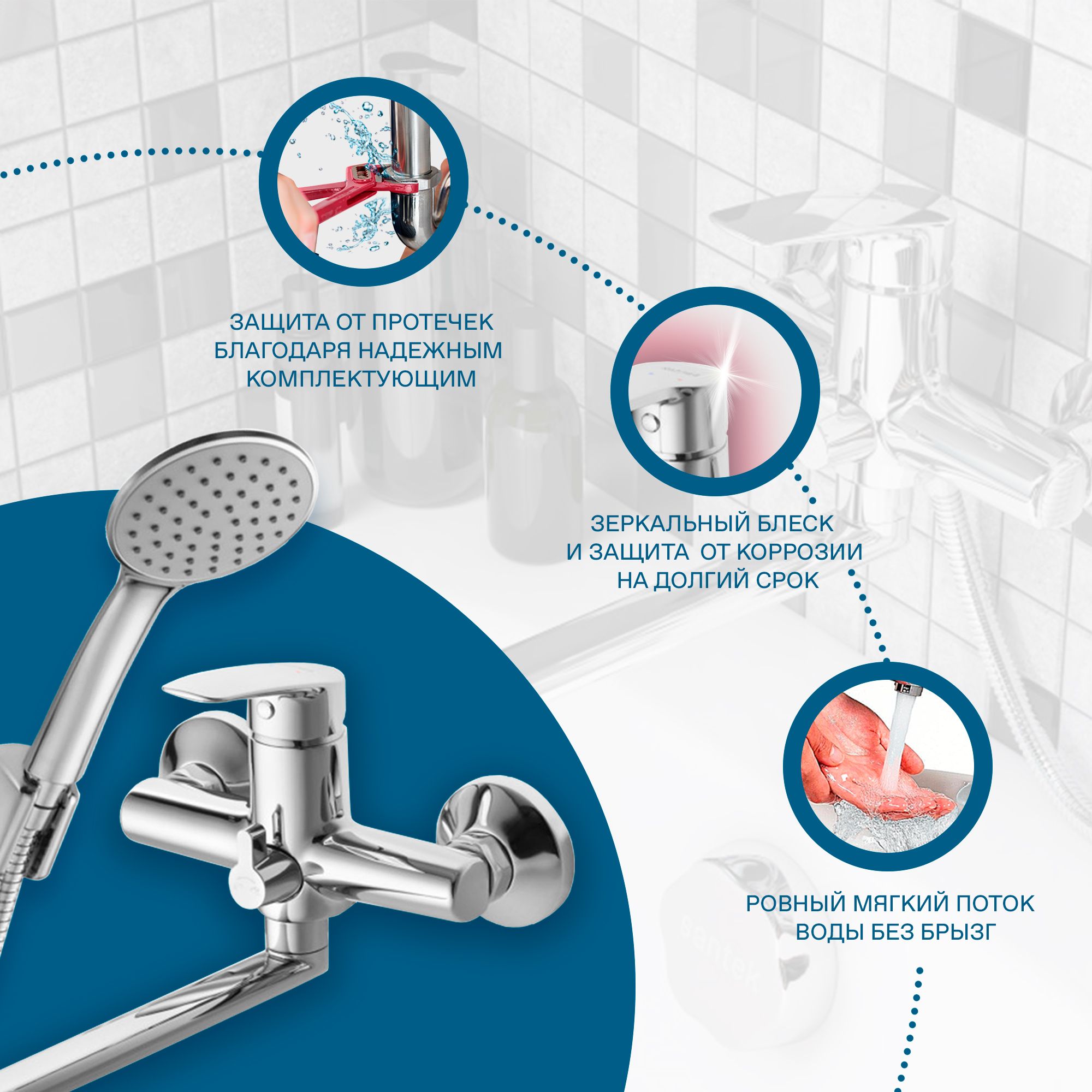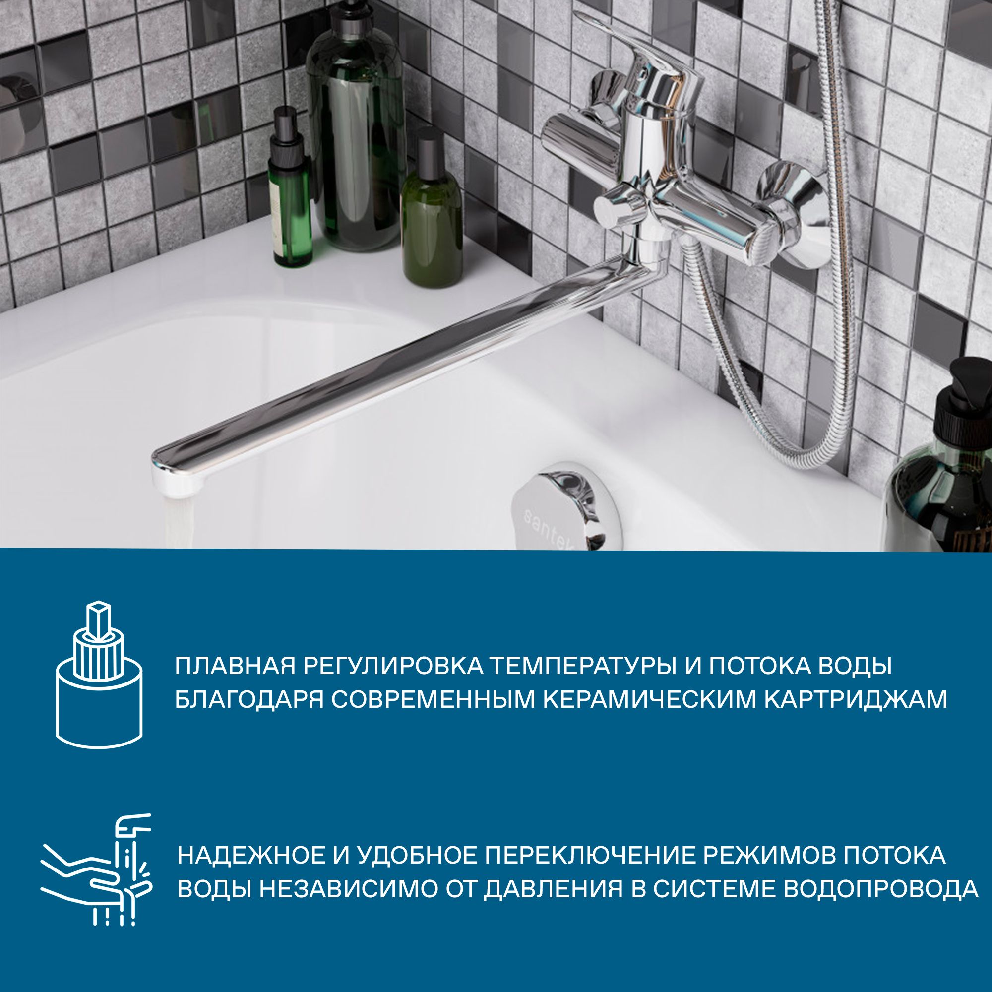 - поворортный керамический переключатель ванна/душ: надежное и удобное переключение режимов потока воды независимо от давления в системе водопровода;