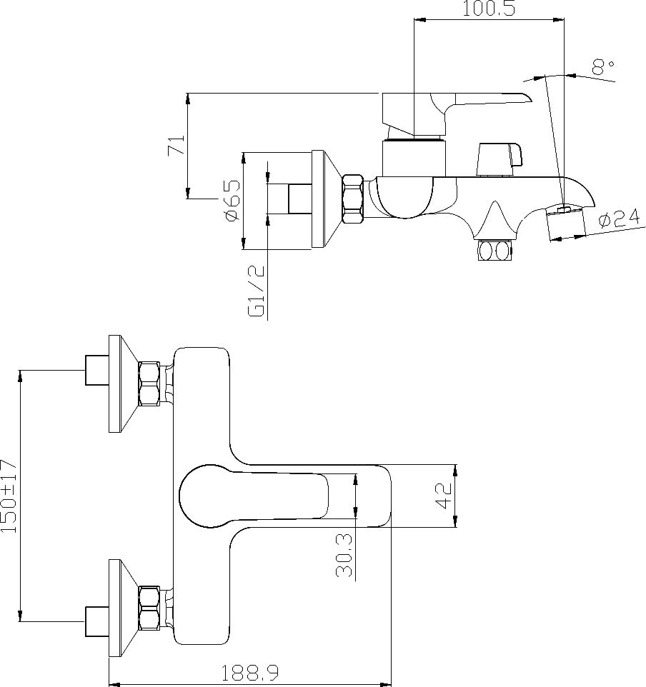 одном из трех положений настенного держателя. Корпус смесителя