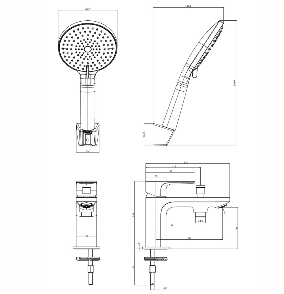 крепления, настенный держатель, душевой шланг, душевая лейка, аэратор, переключатель потоков
