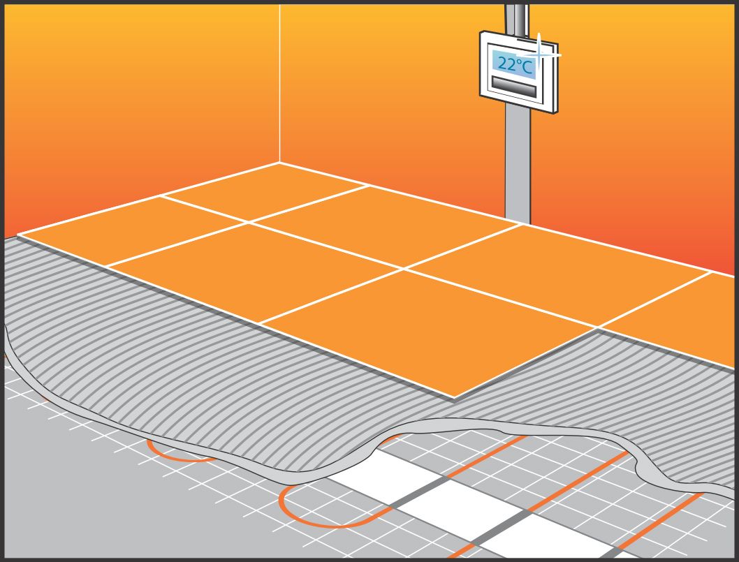 Толщина кабеля менее 5 мм, что позволяет использовать минимальную толщину плиточного клея 8-10 мм