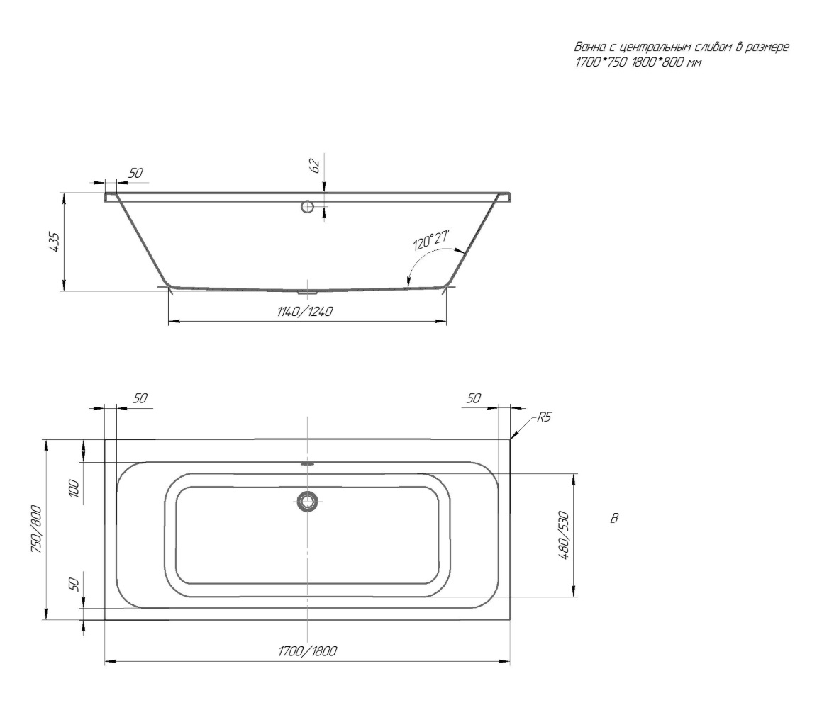 Акриловая ванна Акватек Мия 170x75 слив в центре |