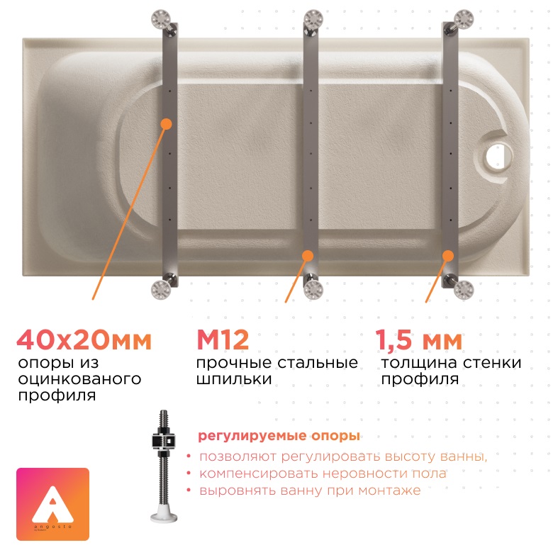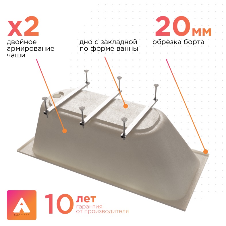 «Прованс АНГОСТО» от Radomir — это прямоугольная встраиваемая ванна с симметричными спинками, созданная для максимального комфорта и безупречной интеграции в интерьер.
