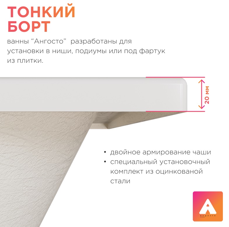 Благодаря низкому (20 мм) борту, модель легко встраивается в нишу или под фартук из плитки.