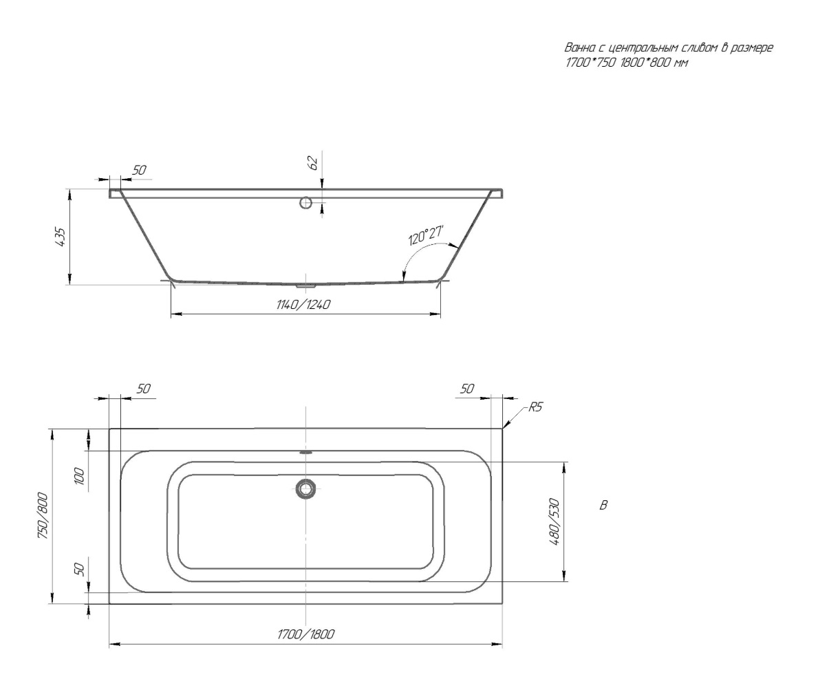 Акриловая ванна Акватек Мия 180x80 слив в центре |