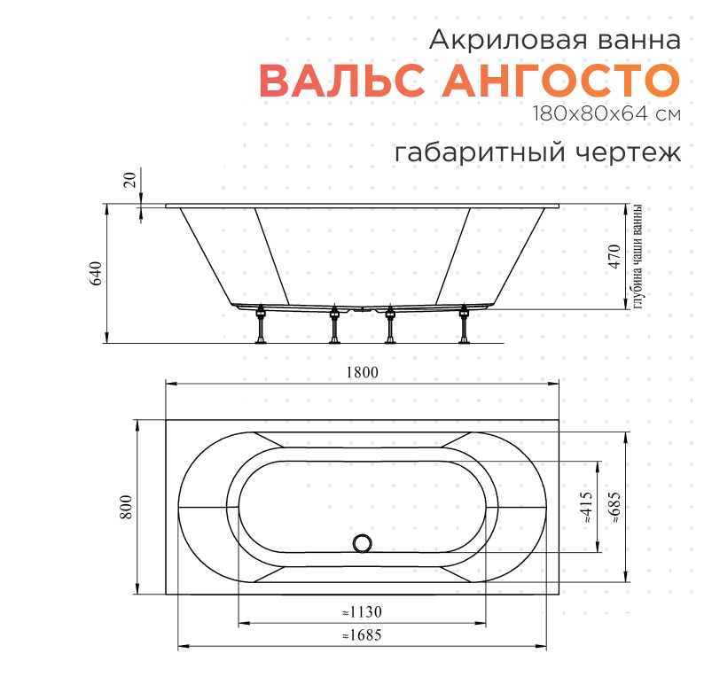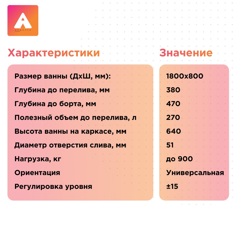 Ванна «Вальс АНГОСТО»— это прямоугольная акриловая ванна с тонким бортом 20 мм, предназначенная для встраивания в нишу или под фартук из плитки.