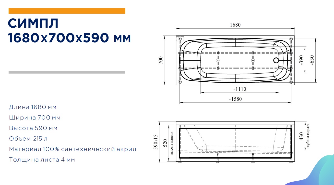 Акриловая ванна Simple 168x70 |