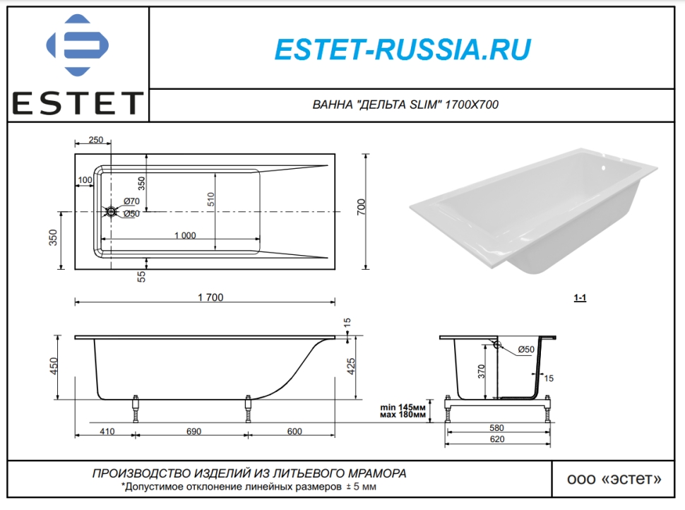 Ванна из искусственного камня Эстет Дельта slim 170x70